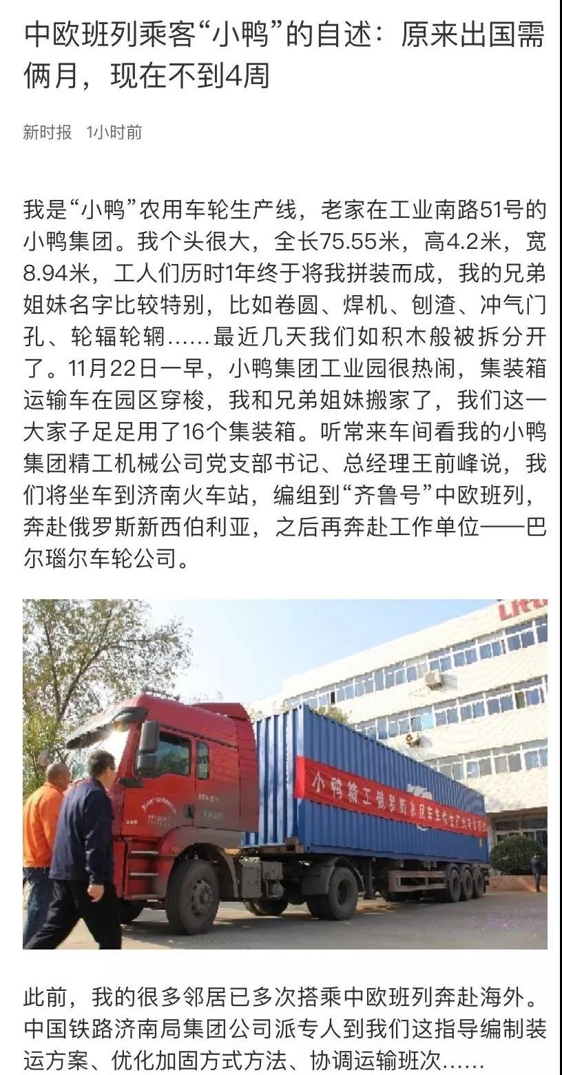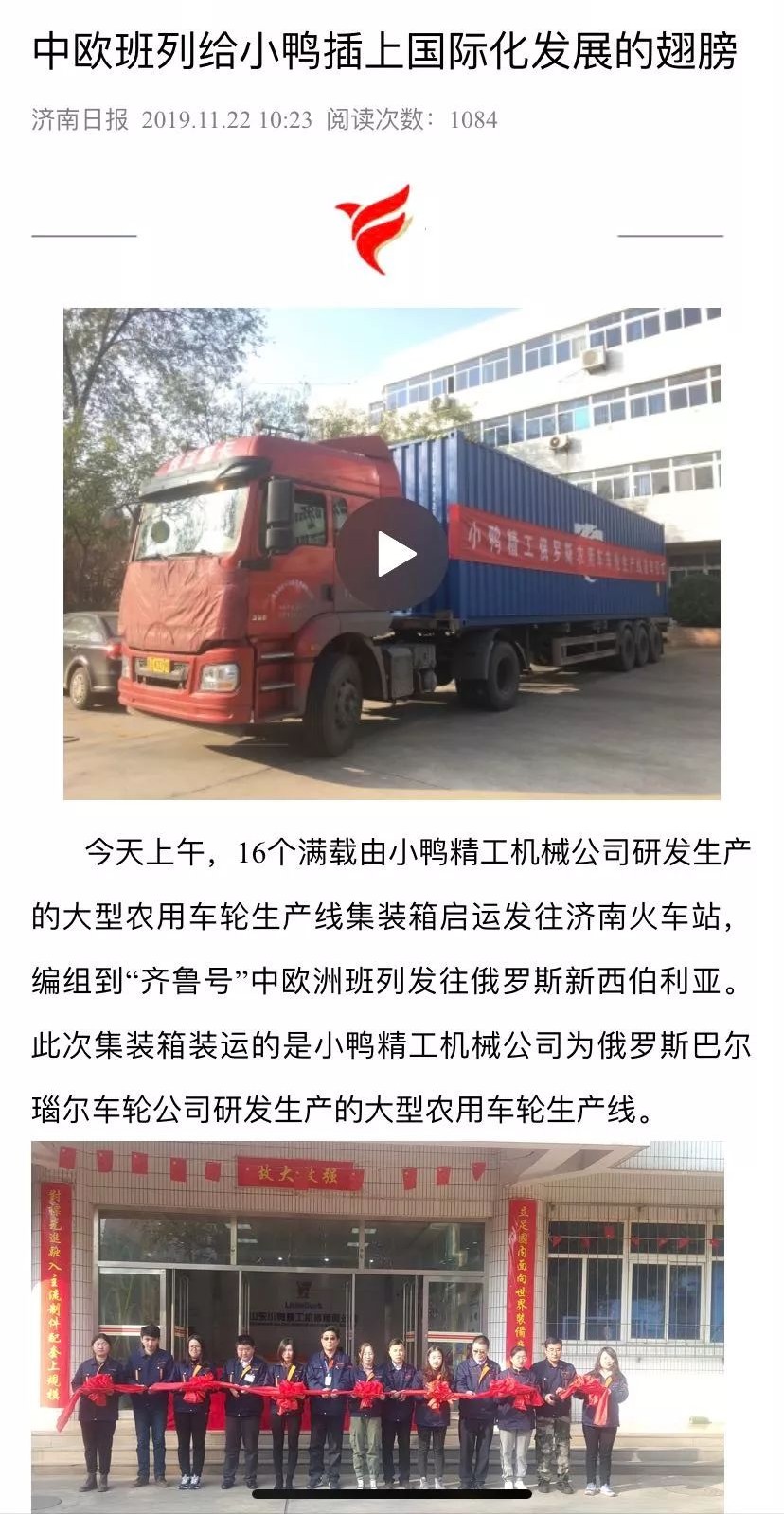 11月22日,小鴨精心海外農用機械車驅動輪生產加工線發車開幕典禮正式啟動,16個集裝箱將連續發到濟南火車站,編組到"齊魯號"墨西哥鐵路發到墨西哥新西伯利亞。