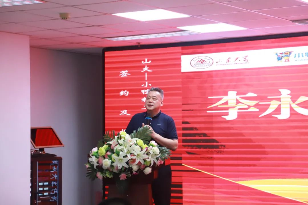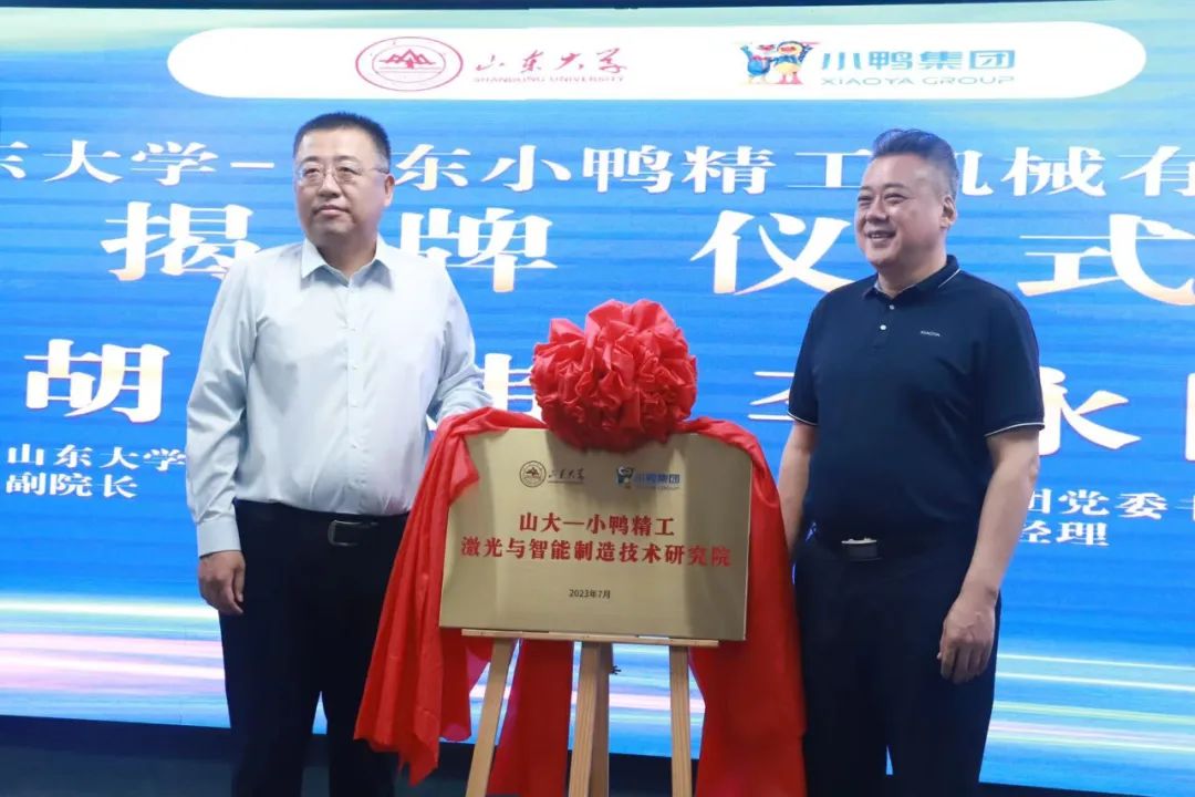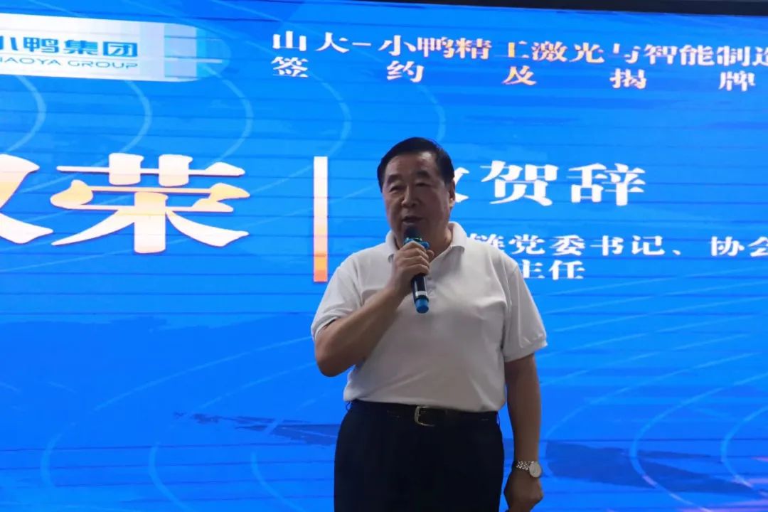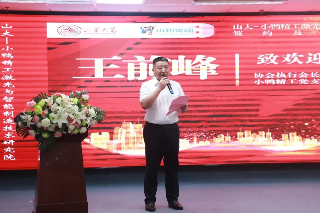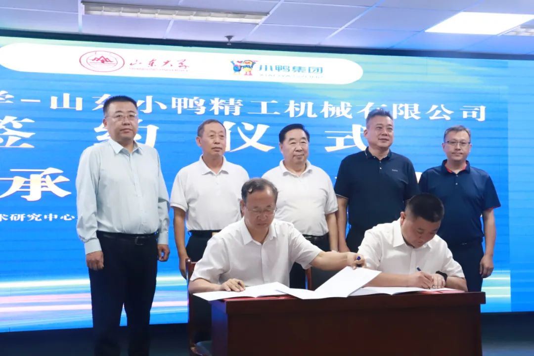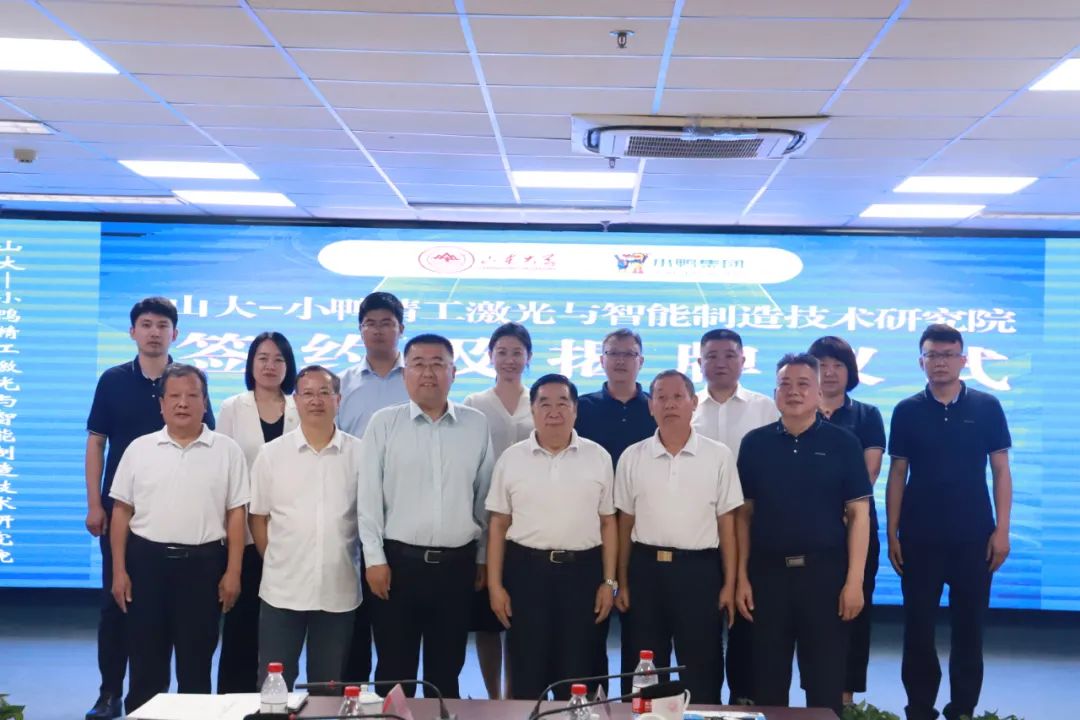 小鴨精心黨組織布告、總司理王前峰和深圳上大學張承瑞給加盟商合作簽訂的山大-小鴨做成激光機器與自動化做成學手藝專題討論院聯建和談。