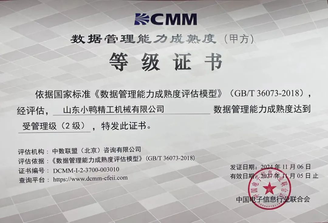 經專家組評價,根據國度規范《數據辦理才能成熟度評價模子》(GB/T36073-2018),小鴨精工榮獲DCMM2級證書,數據辦理才能成熟度到達受辦理級(2級),這一聲譽不只是對小鴨精工數據辦理任務的必定,也是對小鴨精工智能制作軟件系統成熟度的承認。